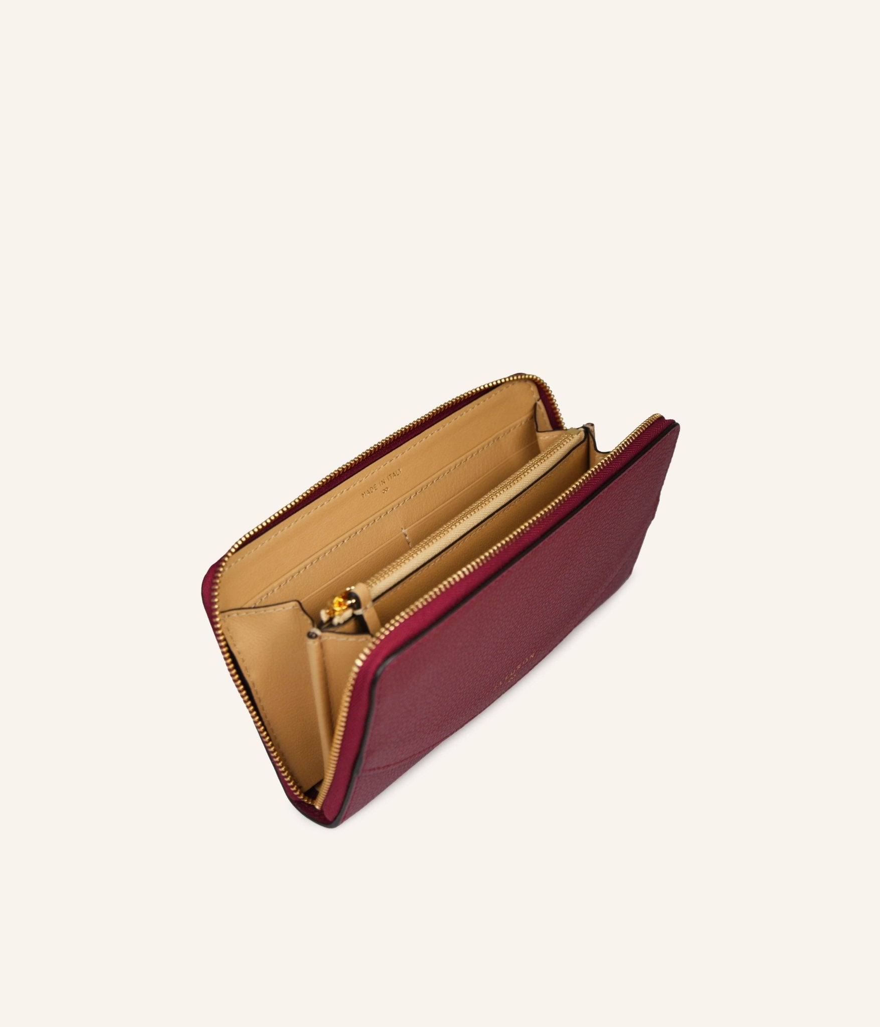 Let yourself be drawn to the depth of Bordeaux, a rich and elegant shade that brings character and sophistication to your everyday essentials. The Ora zip wallet, crafted from grained calf leather, combines refinement with everyday practicality. Its carefully organized interior offers ample space for cards, banknotes, and coins. Made in Italy, it reflects the perfect balance between timeless design and artisanal craftsmanship.