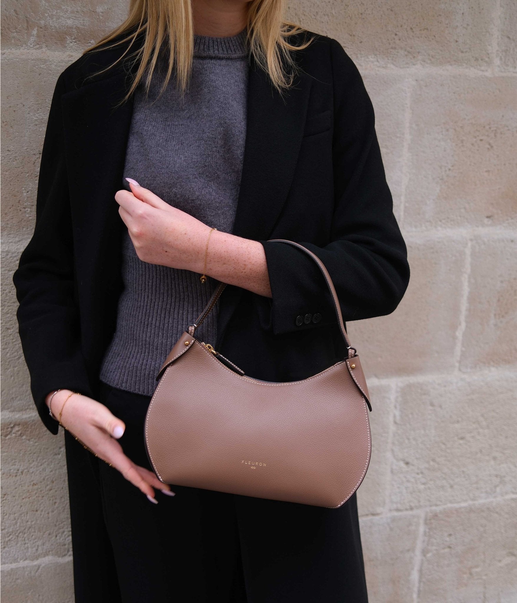 With its soft, nuanced tone, our Marron Glacé Pivoine bag brings a natural and understated elegance to your wardrobe. This light brown with warm undertones, somewhere between soft cocoa and creamy beige, pairs beautifully with refined, light-toned outfits. It goes especially well with shades like ecru, blush pink, or warm beige for a gentle, balanced look. In colder months, it also complements deeper hues like slate blue, sage green, or charcoal grey, creating a clean and sophisticated silhouette.