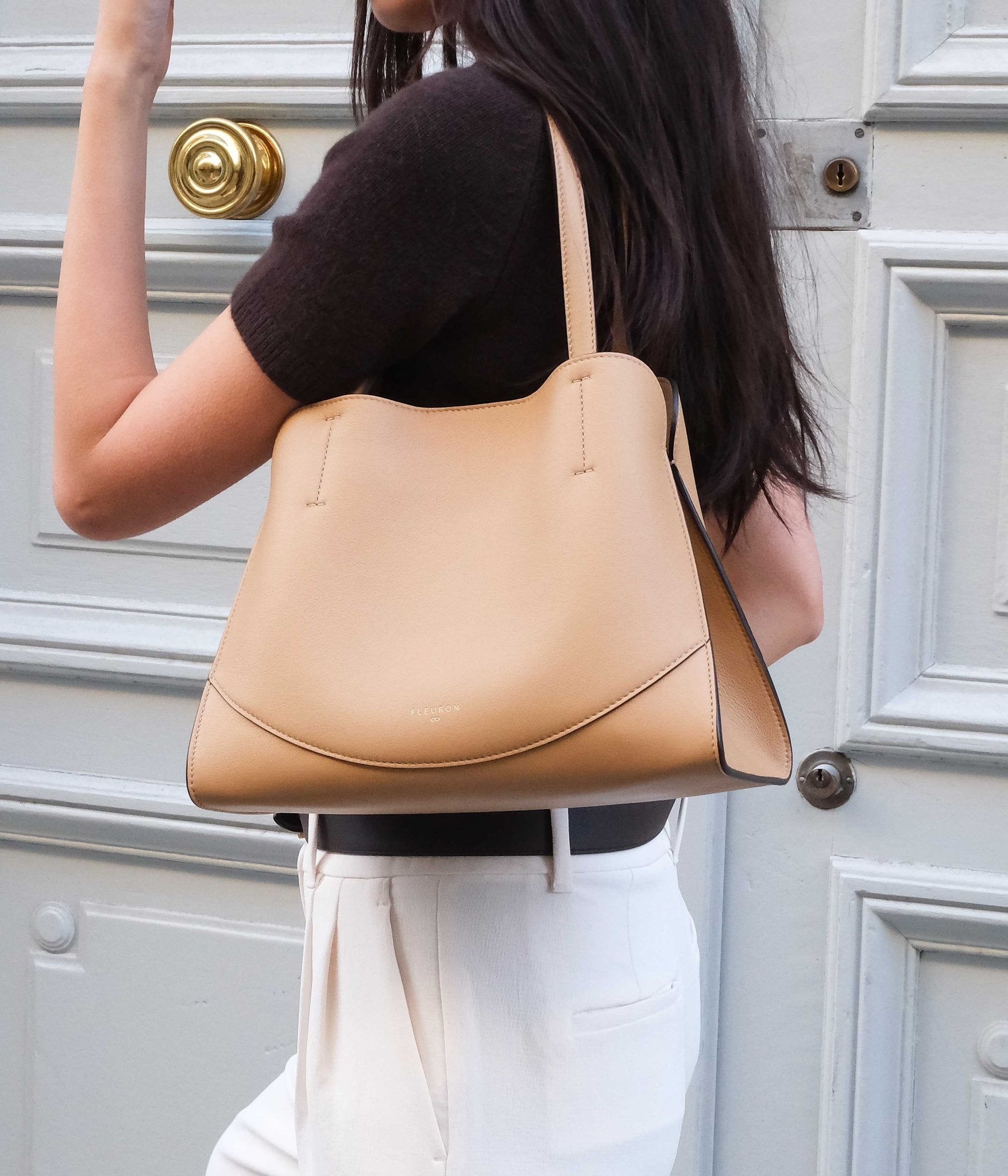 The Mini Oak in Cookie Calfskin charms with its soft, luminous tone and compact, refined design. Its structured silhouette offers just the right space for your essentials while adding a warm, elegant touch to any outfit.