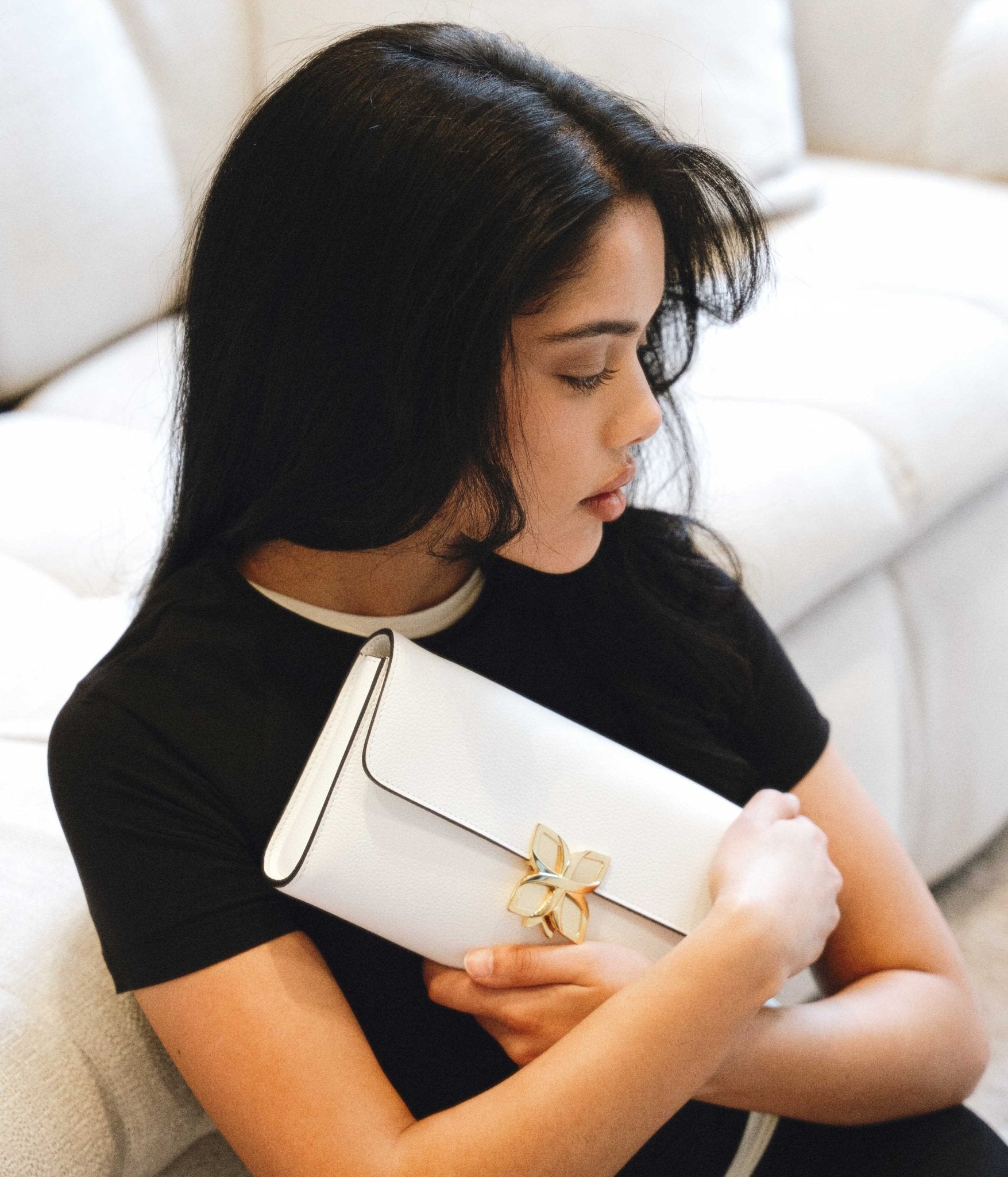 A refined take on the iconic Hortensia bag, the Clutch preserves its floral soul while reimagining it with a light, graceful touch. Its clean lines echo the softness of a petal, while its slender shape whispers of evening elegance.