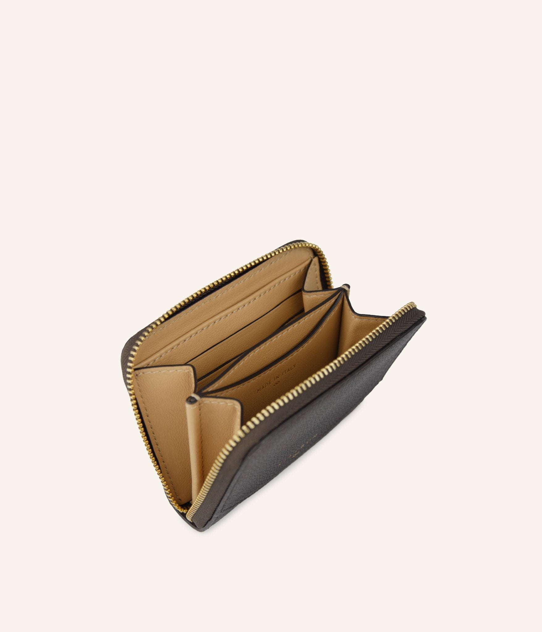 Crafted in Italy using exceptional artisanal savoir-faire, the Ora Small Espresso zipped wallet in grained calf leather combines elegance and practicality. Its compact format reveals a thoughtfully designed interior, offering space for cards, notes, and coins with ease. The deep, warm Espresso shade brings a timeless character to everyday essentials, effortlessly suited to any occasion. A refined accessory where functionality and aesthetics come together seamlessly.