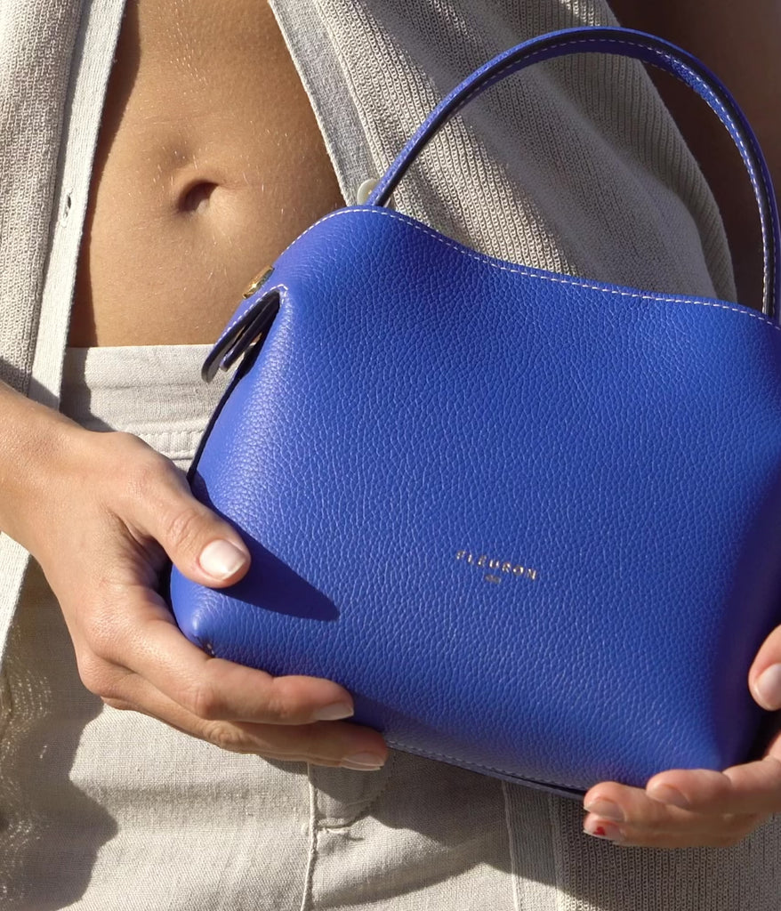 A supple silhouette, an elegant touch with its top handle, the sides fold and unfold like the beating of a wing, for an airy look. The Swann, available in a mini format, has an elongated shoulder strap that leaves your hands free. Make a bold statement with our Fleuron bag in cobalt blue. A true signature of our brand, this vibrant color electrifies your outfits and adds a nautical touch to your white and beige ensembles. Handcrafted in our workshop in Italy, this bag in grained calf leather features golden details and a beige interior. Its practical and chic design allows you to carry it by hand, on the shoulder, or crossbody thanks to the removable shoulder strap.