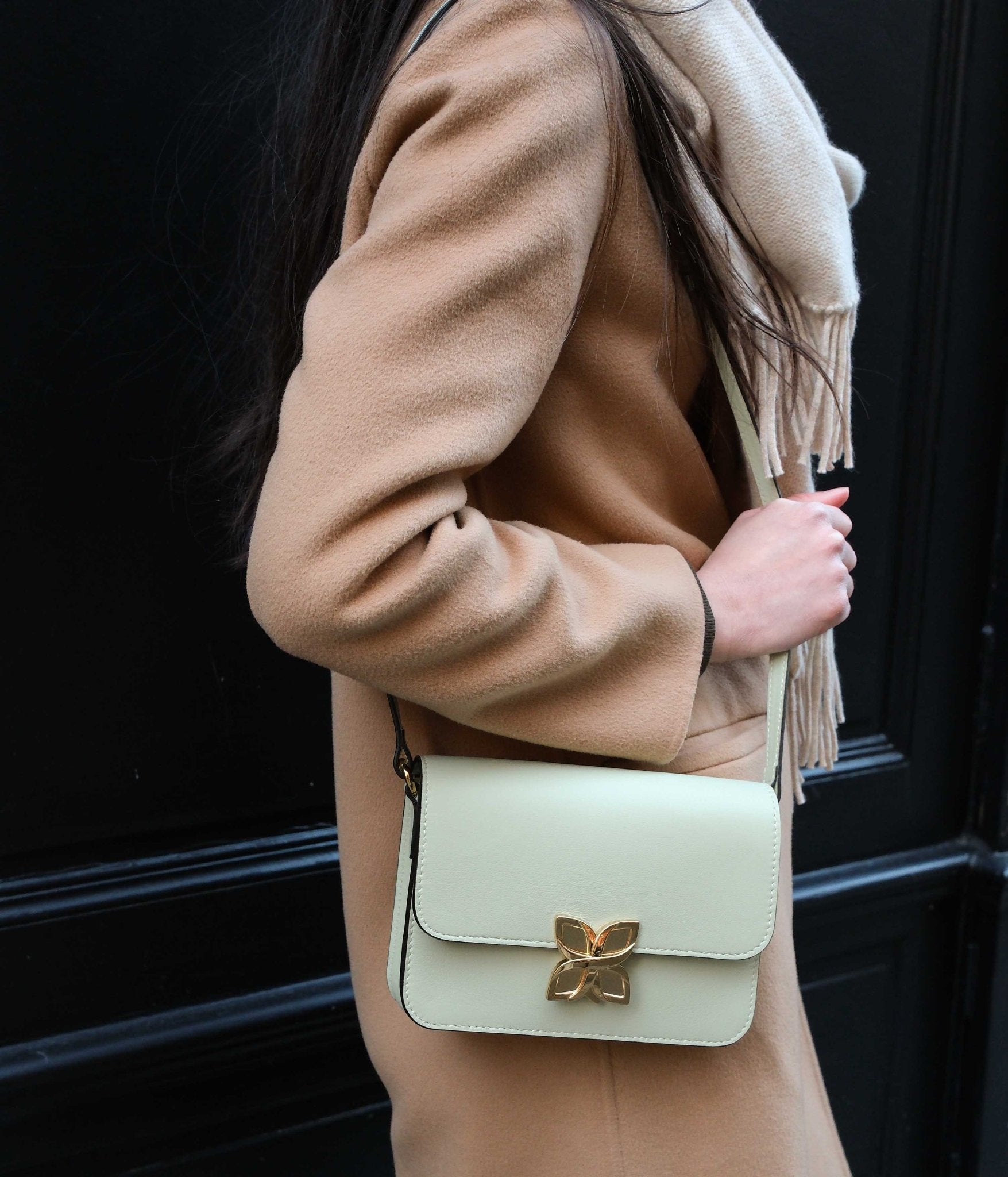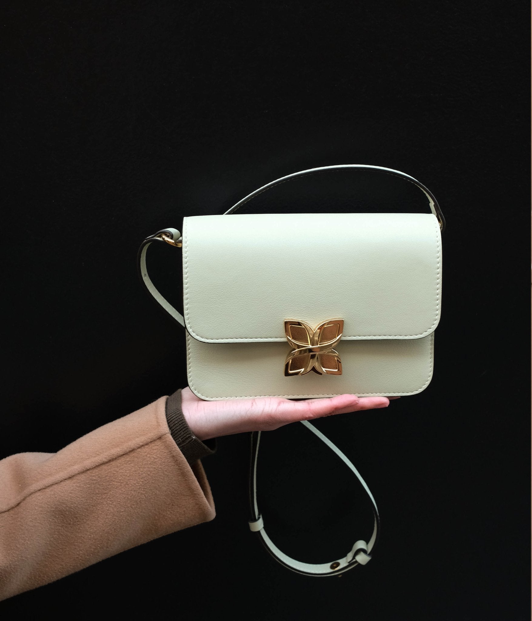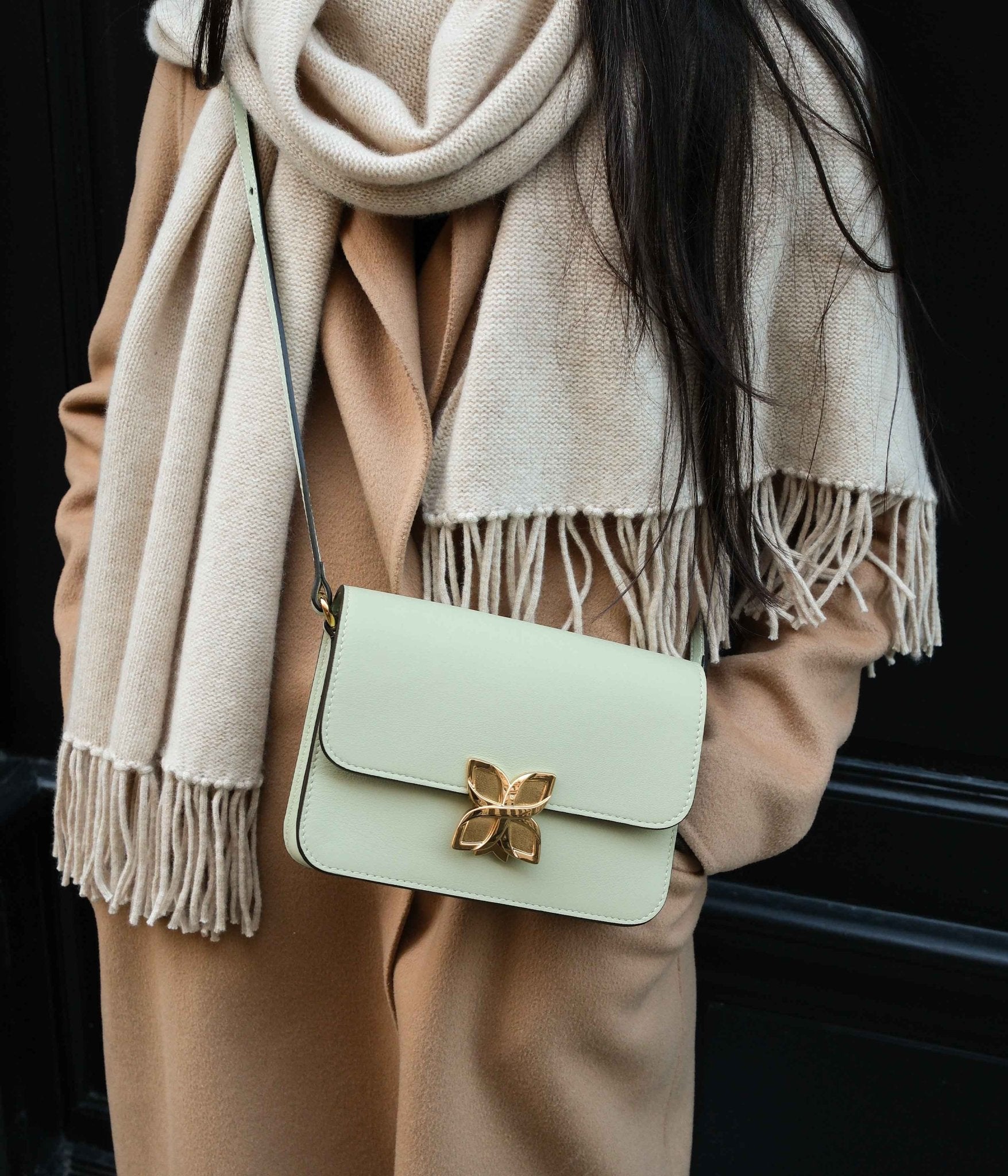 Pair the Mini Hortensia in Water Green with a palette of light, natural tones for an airy and harmonious look. Shades of beige, sand, off-white, or light gray enhance the softness of this delicate hue, creating a modern and understated allure. For a bolder contrast, pair it with touches of terracotta or ochre to add a warm, balanced dimension to your outfit.