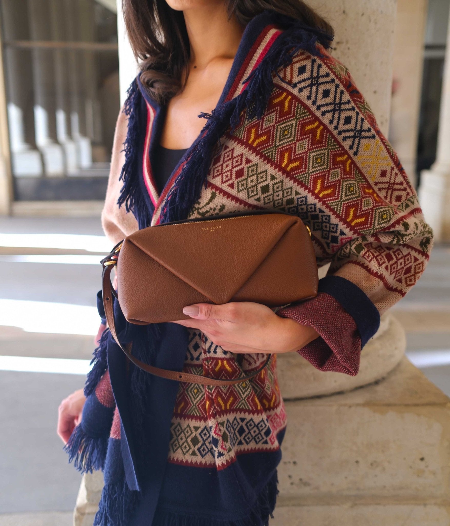 Its adjustable strap offers multiple carrying options : as a clutch, over the shoulder, or as a short crossbody depending on the occasion. The Trinity in Brown pairs beautifully with warm tones like beige, camel, or terracotta for a soft and harmonious look. It also creates striking contrasts with bolder shades like navy blue, charcoal grey, or emerald green for a more sophisticated and confident silhouette.